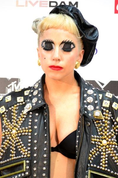 Lady gaga appeared wearing thick gold studded boots and no bottoms. When she removed her sunglasses, eyes could be seen painted over her eyelids which she laughed off in front of reporters saying, "What? Is something funny?" Afterward she never opened her eyes throughout the conference.